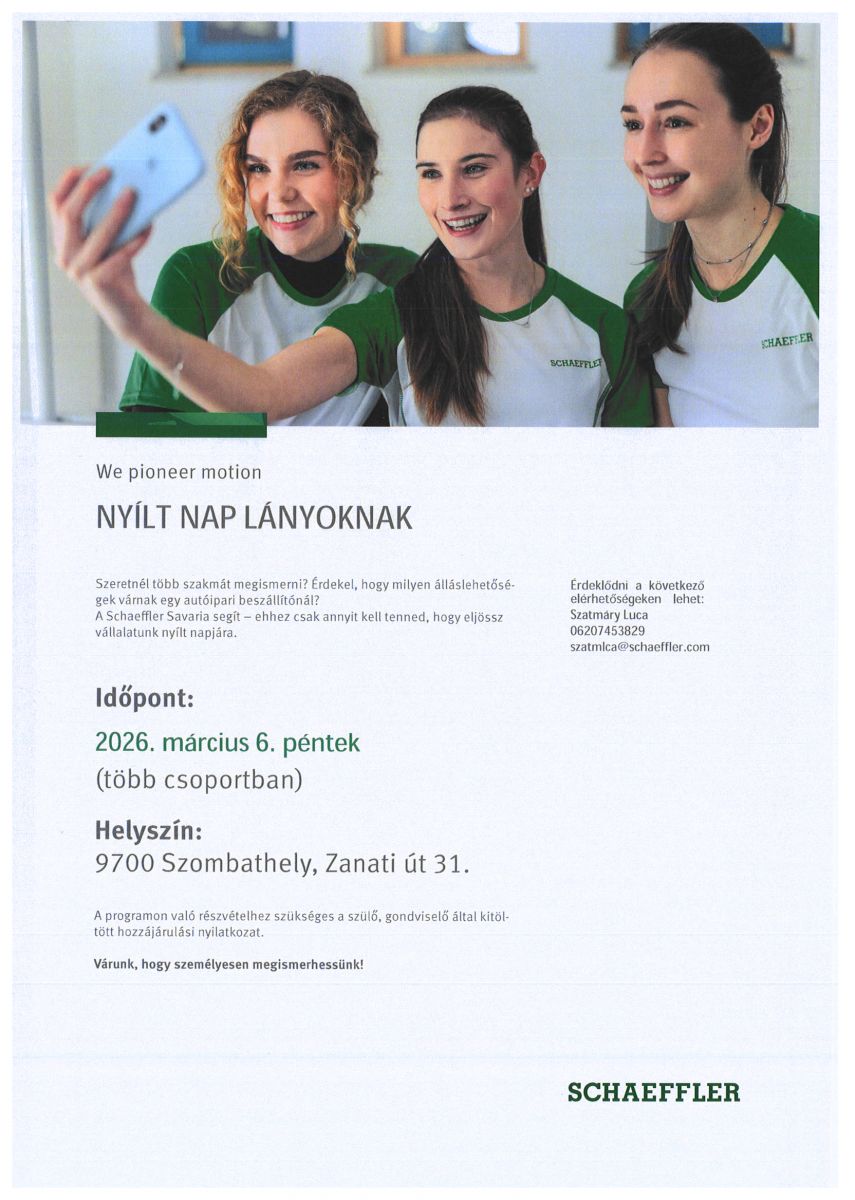A korábbi évekhez hasonlóan 2026.03.06-án pénteken megrendezésre kerül a „Lányos nap” elnevezésű program a Schaeffler Savaria Kft.-ben. A Nyílt napra 7-8. osztályos lányokat várnak a szervezők.
